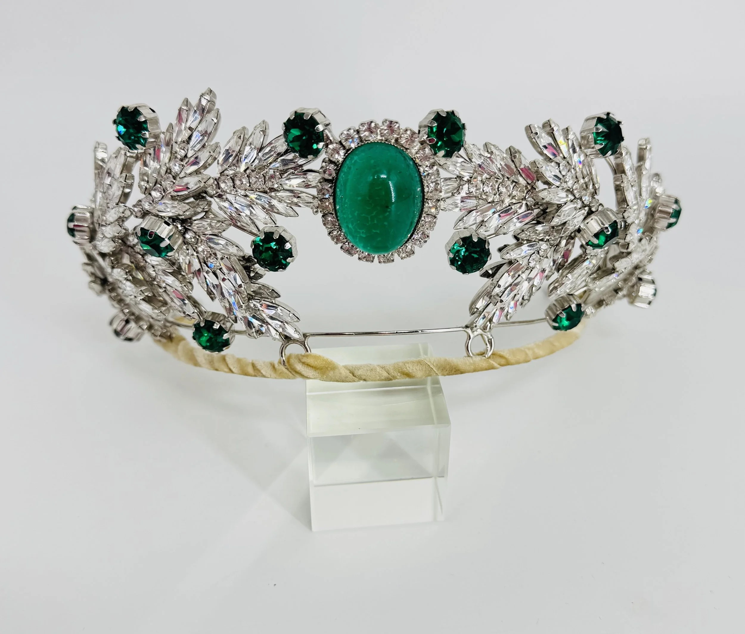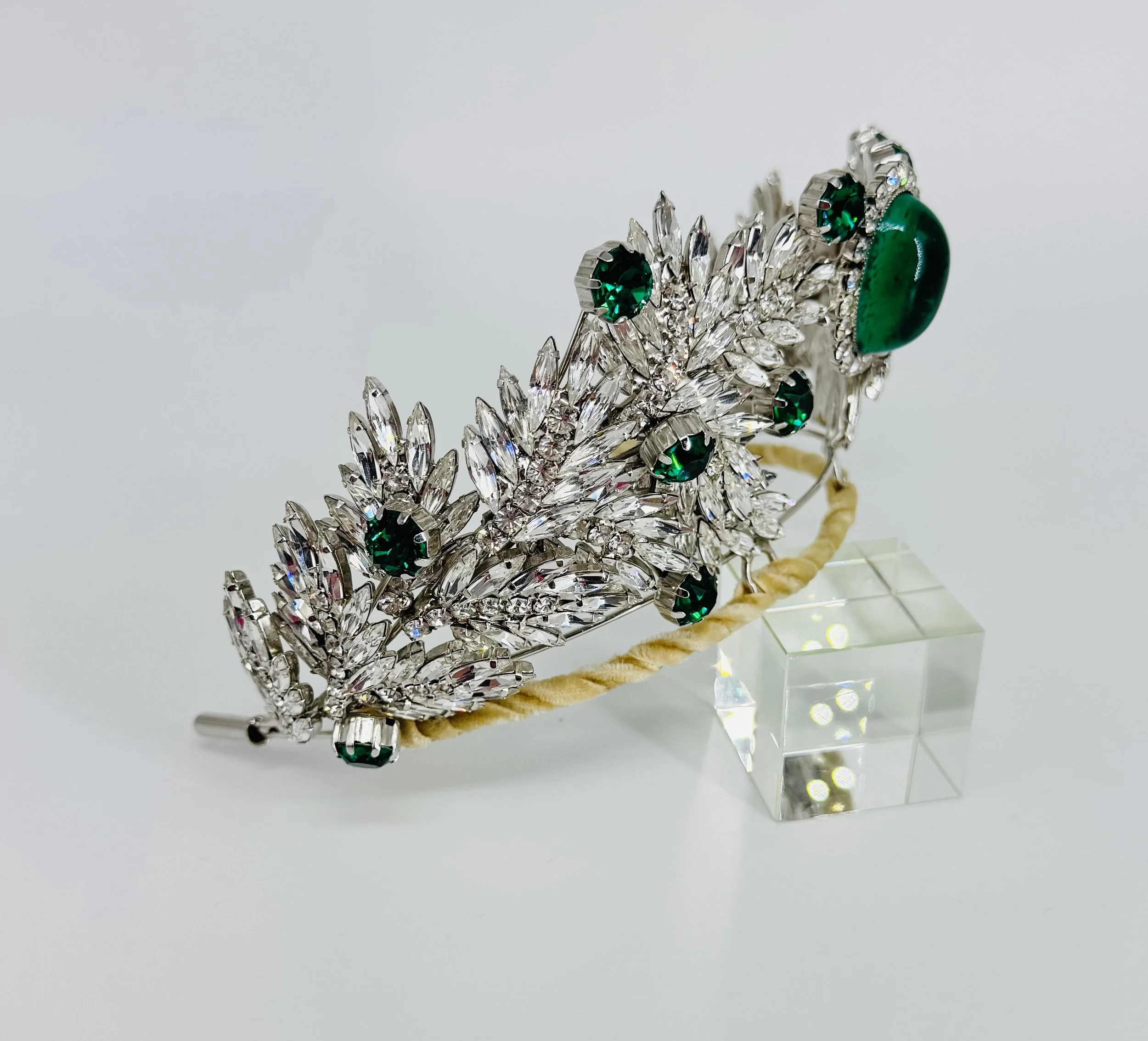 Referencing the tiara from Napoleonic era, I built one for Michael Zoff, evening wear designer. In February of 2019 Michael and I opened Fashion Week. We designed the collection together; he would bring over the fabric samples and I would pull up stones for the jewelry. That emerald Napoleonic tiara was the finale, on the bride. She was wearing an off-white bridal gown completely covered with emeralds. It was all based on Russian and Napoleonic jewelry. It was a big lacy necklace, with a dog collar, and a long cross on a chain, it was really gorgeous.