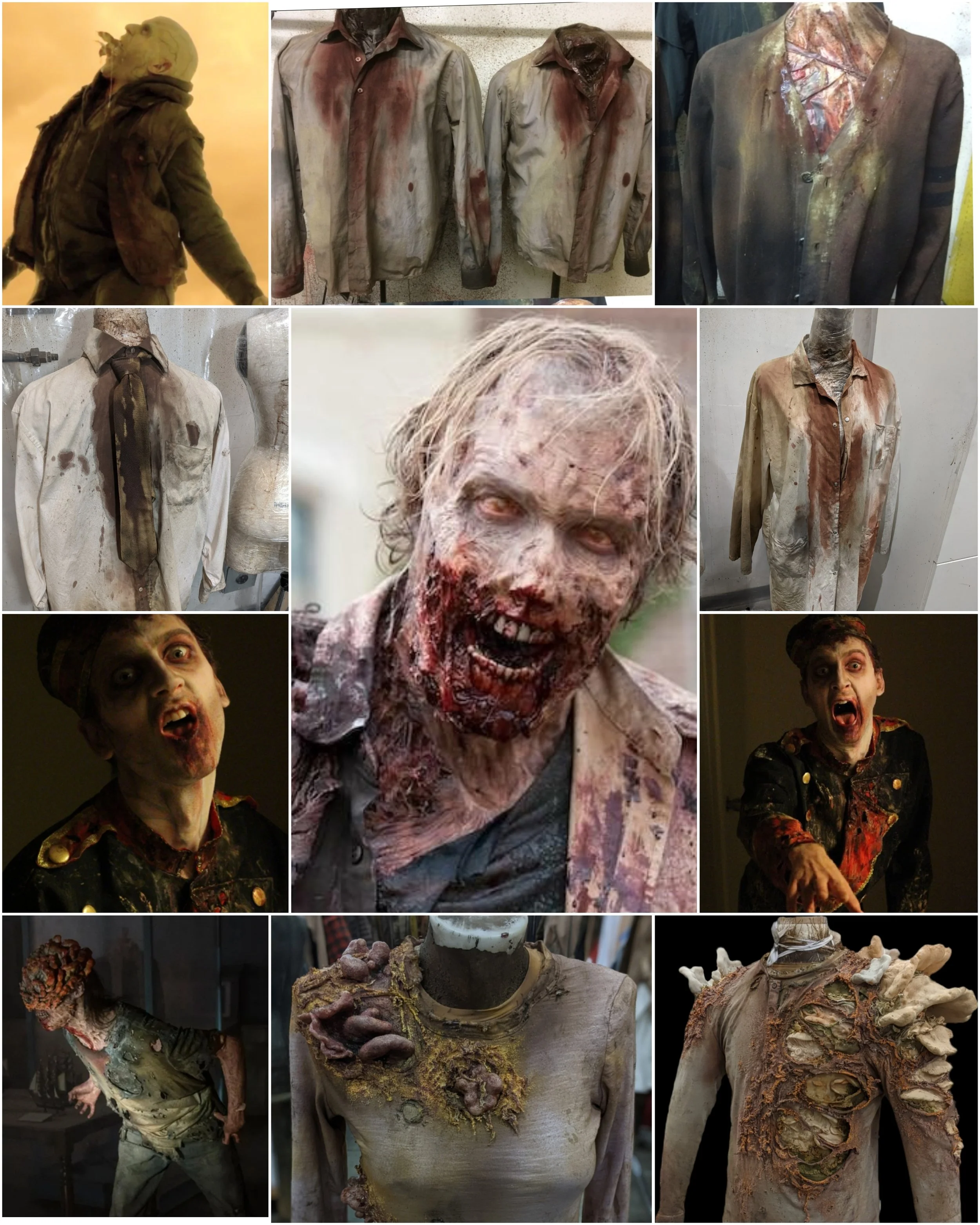Sarah “Bloodstain” Blostein’s work on zombies. Row 1: Stregoi from The Strain, Season 4. Costume designed by Delphine White Crane. Row 2: Dead Bodies from Y: The Last Man, costume designed by Olga Mill. Row 3: Zombie Bellhop from Halloween Costume. Row 4: Clickers and the Walking Dead Zombie (centre) from The Last of Us, Season 1. Costume designed by Cynthia Summers. Image courtesy of Sarah “Bloodstain” Blostein.