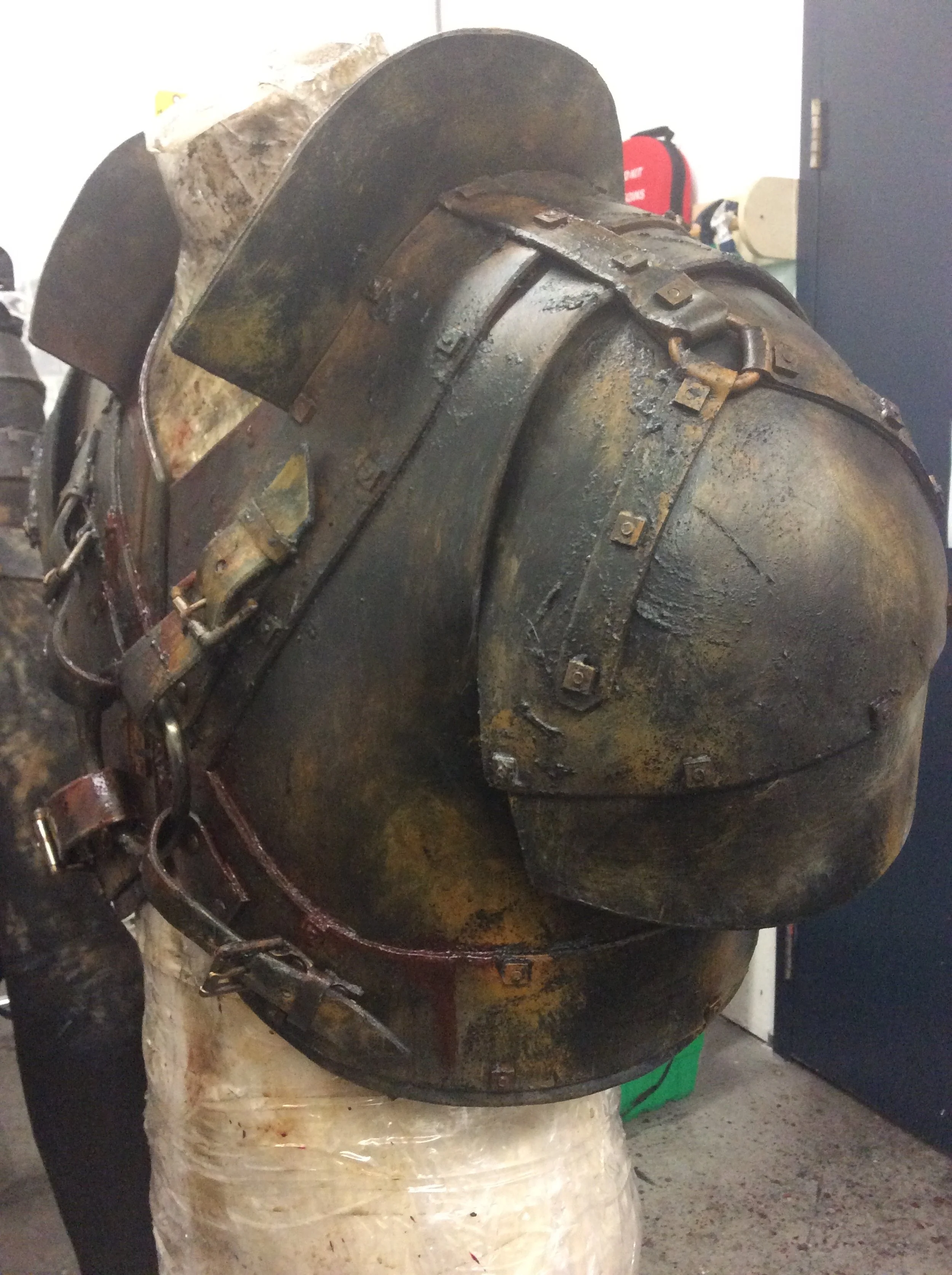 In the simplest of terms, the Designer provides me and my department with photo reference, illustrations or just a verbal description of what the costume should look like on camera (be it “gold encrusted,” or “like it’s been worn for three years,” or “they fell down a hill and here’s a sample of the dirt from set,” or “they got shot in the shoulder.”) Then my job is to figure out how to do that, not why they look like that. Even the amount of blood or dirt is generally the decision of the Designer and/or Director – it’s their vision that’s guiding the look of the show.
