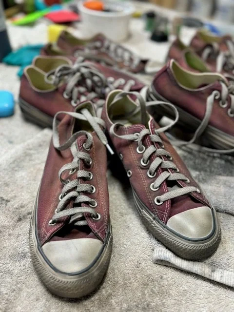 There’s always Ultra-Matte Medium in my kit; I love it for dulling things down. If you mix it with a dot of raw umber, it’s perfect for breaking down things like Converse (there’s always Converse shoes on a show). I also find it works great on dark boots – if you sand the boots down and add a bit of the Ultra-Matte, it really works on camera.