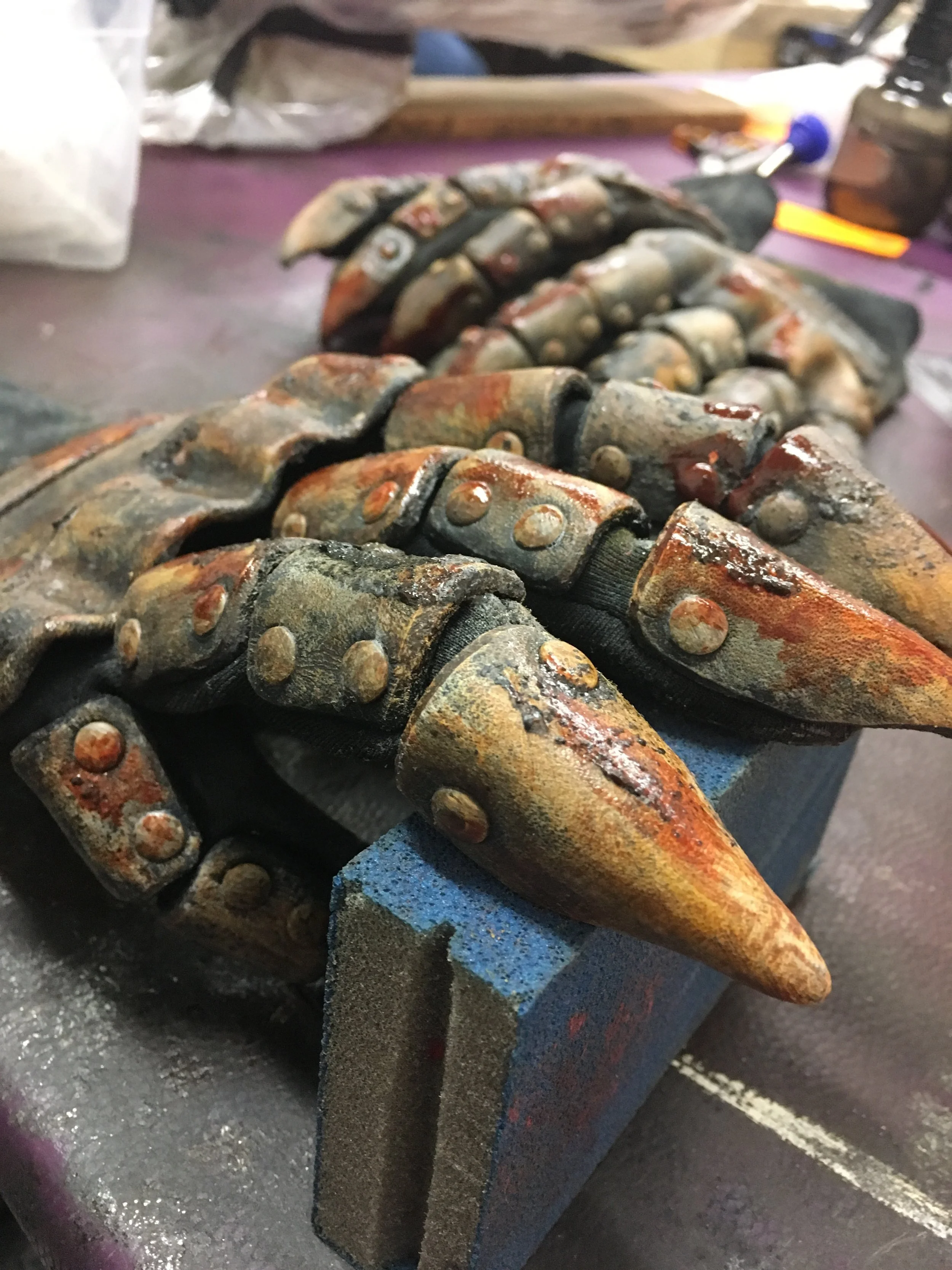 It’s also satisfying when I can use something I learned in costumes/breakdown in an SPFX makeup situation. Because of my own experience, I’m especially happy to be able to turn people on to more lung-friendly products. My original dream was to make monsters for movies but my exposure to a particular glue almost ended my career before it started. Barge adhesive is this super-toxic stuff that just happens to be industry standard; it’s used for shoe making, leather work, and by builders and fabricators. It’s really nasty stuff and can cause permanent nervous system damage. Aquilim is a water-based version that I found out of necessity because I can’t go near Barge anymore. It’s not quite as strong but I think it does a damn good job.